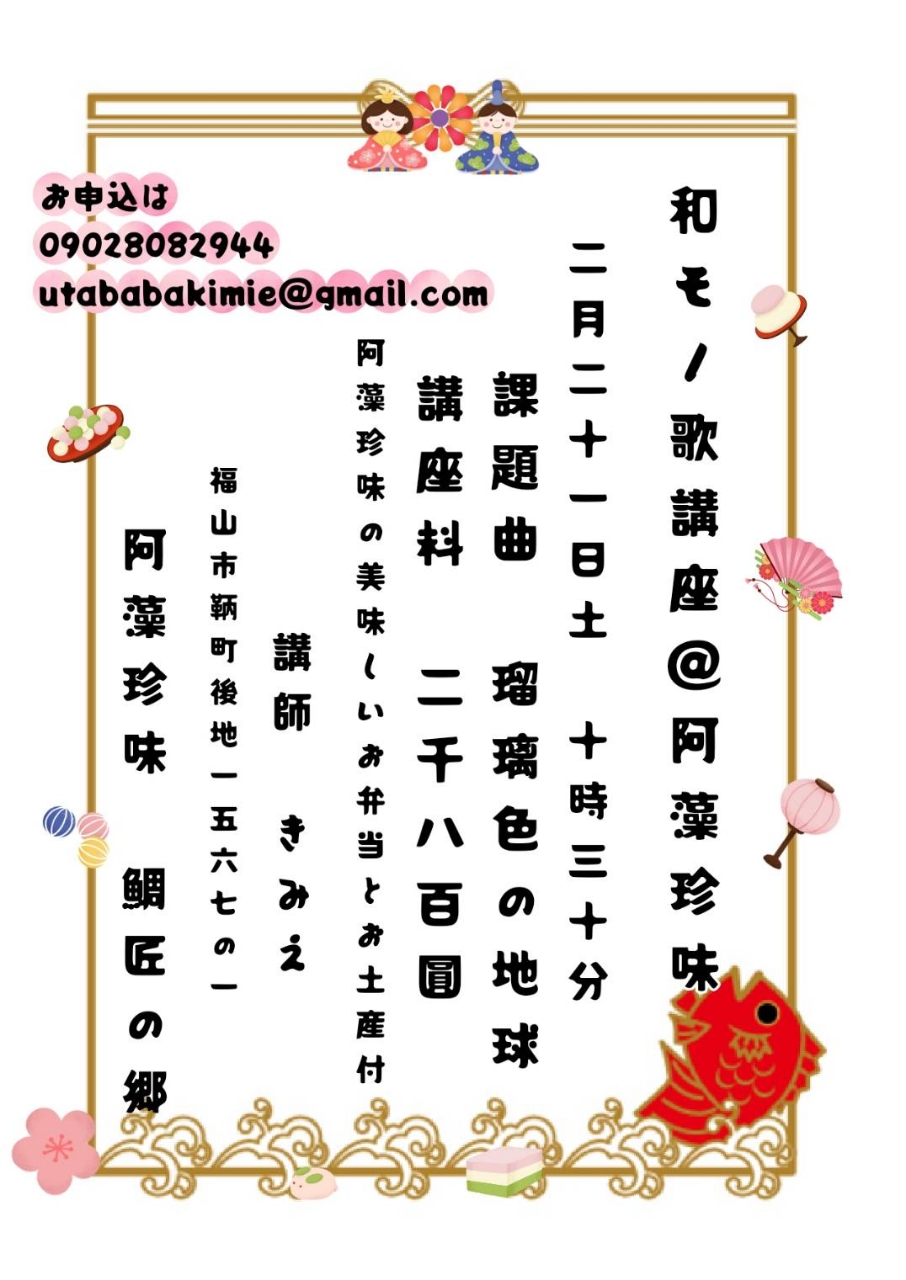 【予告】2/21 和モノ歌講座10:30~【鞆の浦 鯛匠の郷 迎賓館】