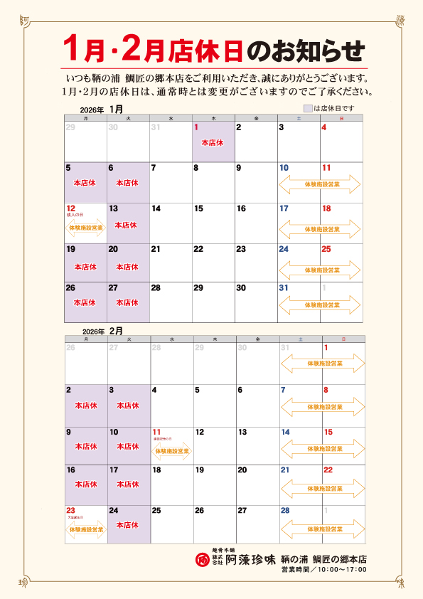 1月・2月の店休日は、通常時とは変更がございますのでご了承ください。