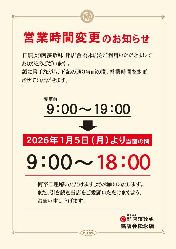 いつも阿藻珍味 銘店舎松永店をご利用いただきありがとうございます。